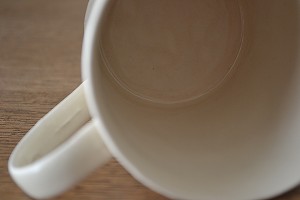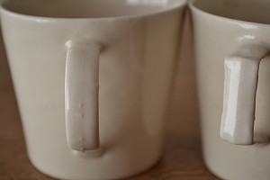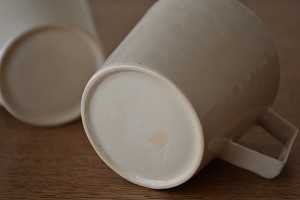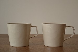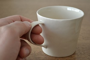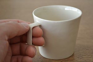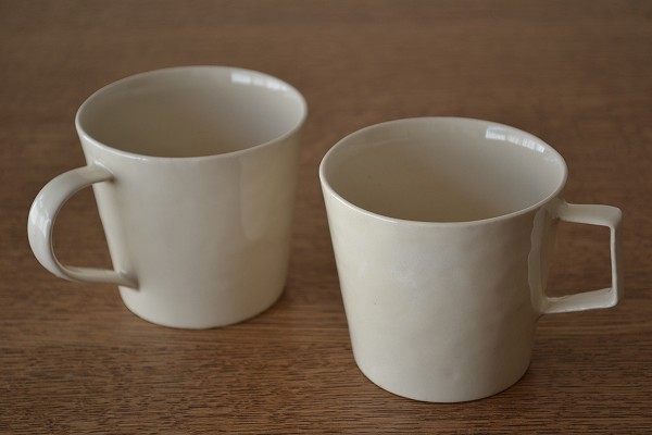 やわらかなアイボリーホワイトのコーヒーカップ。取っ手は角と丸の2タイプあります。