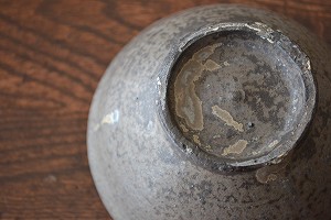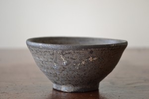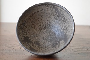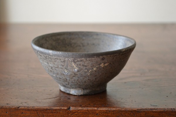 マットな緑褐色の渋い飯碗。ところどころに白っぽく結晶化した釉の反応が見られます。