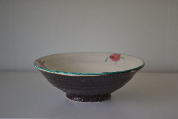 外側が褐釉、内側が粉引に掛分けされ、その上に色絵が施されています。