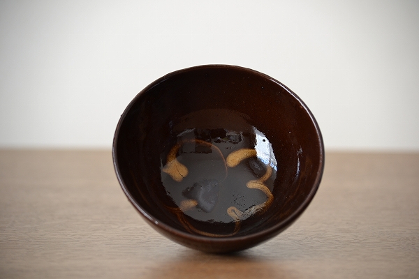 こっくりとした艶のある深い茶色の釉薬に、軽いタッチでぐるぐるっと花のような模様が描かれています。