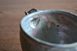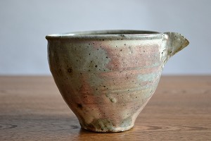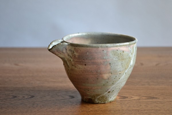 薪窯の複雑な炎に焼かれ、様々な色が混じり合う発色となった片口。