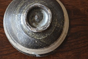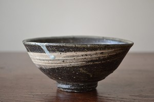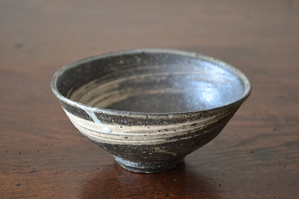 内・外一本ずつの力強い刷毛目が印象的な碗。表面は土灰釉が薄く掛かっていて鈍い艶となっています。
