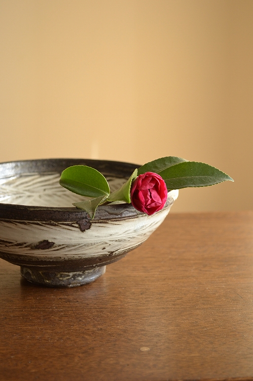 黒三島の鉢は墨色のボディに白の象嵌が映え、料理をこの上なく引き立ててくれます。