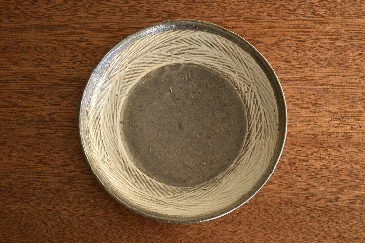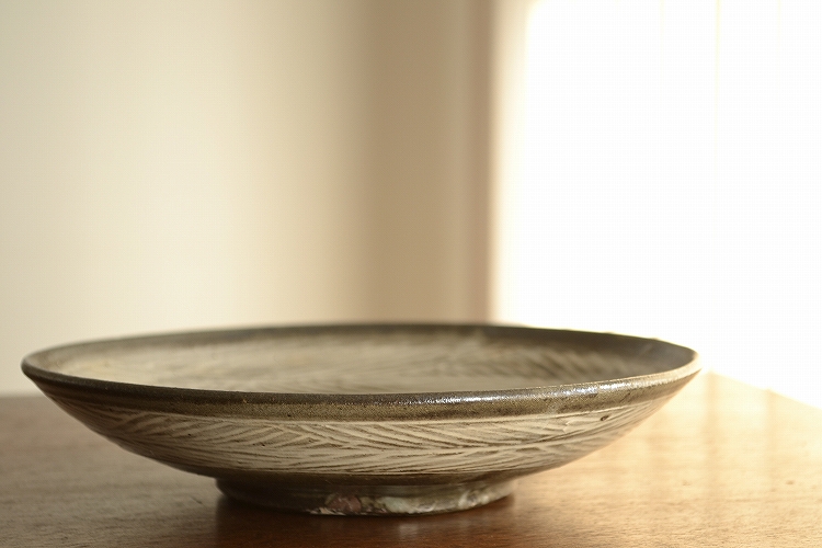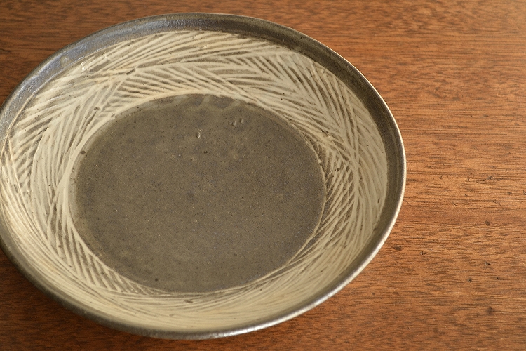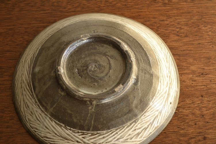 釉薬がやや厚めにかかったのか、いつもの黒三島に比べやや薄い色合いに焼き上がったこの皿は、