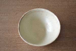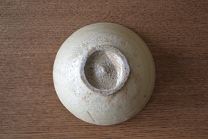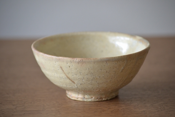薪窯で酸化焼成された黄色い色調の粉引碗です。