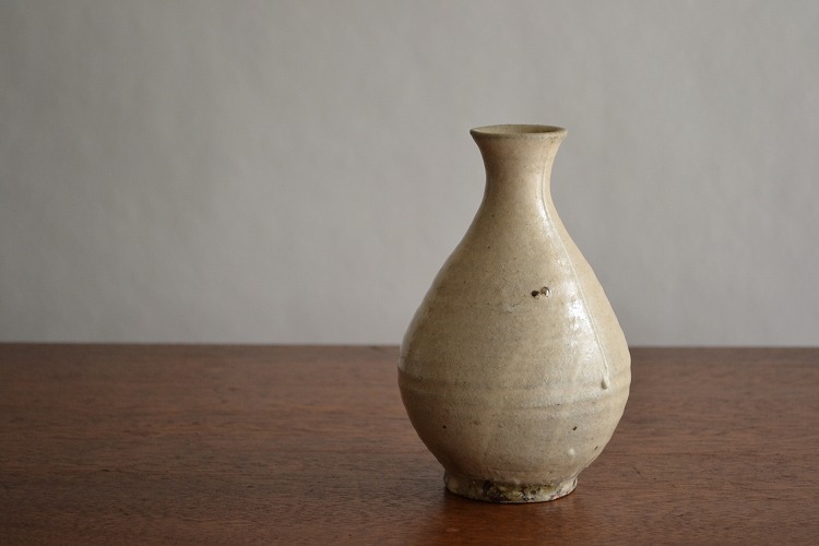 薪窯で焼いた粉引の徳利は、失透気味のしっとりとした艶を持つ、ベージュの色合いで、安定感ある佇まい。