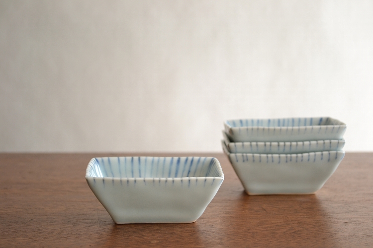 小さくて深さのある四方小鉢。いわゆる作家ものの器としてはあまり見かけない形で、