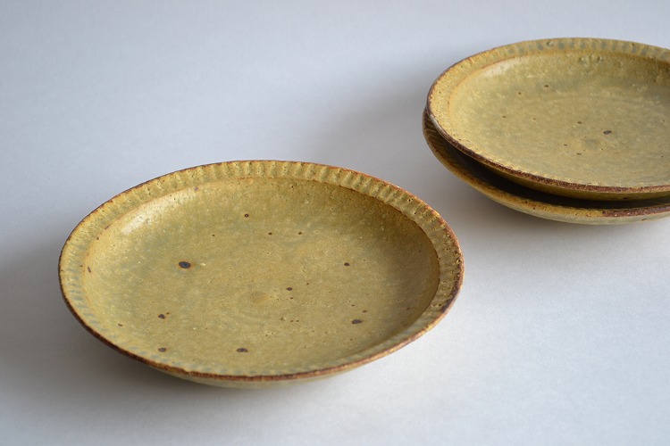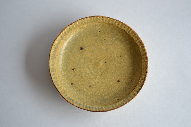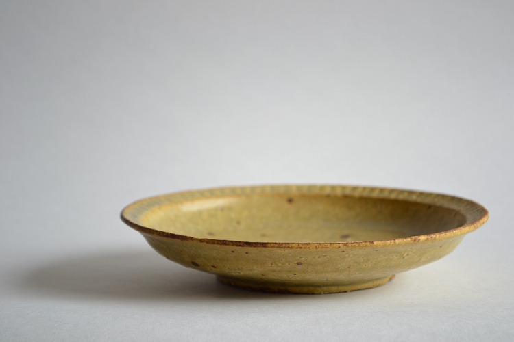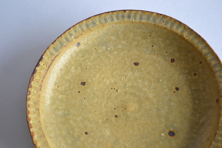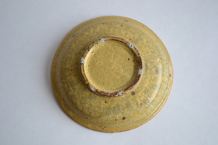 マスタードイエローに緑の釉薬と茶色の焦げ、鉄粉が絶妙のバランスでいい味を出しています。