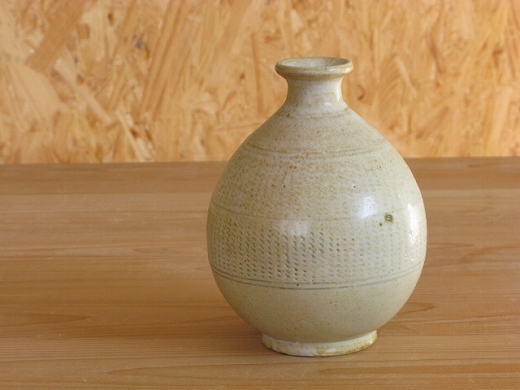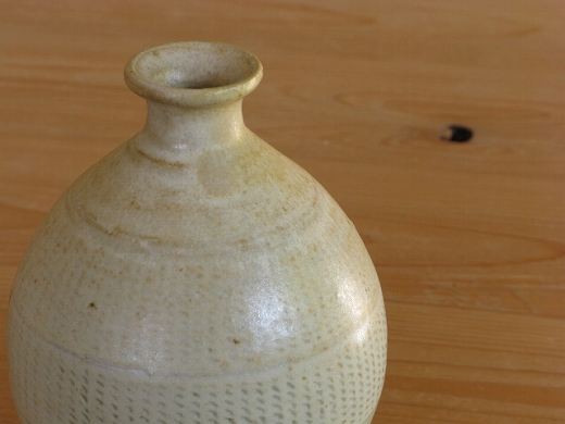 青木亮さんの薪窯で焼いた灰釉象嵌の徳利です。